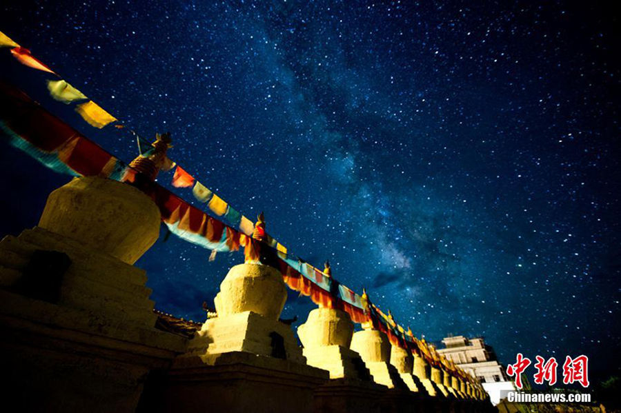 Waqie pagoda forest combined with countless prayer flags form the most fascinating scenery in a summer night in Hongyuan County of Aba (Ngawa) Autonomous Prefecture, Sichuan province. (Chinanews/Yang Yaguang)