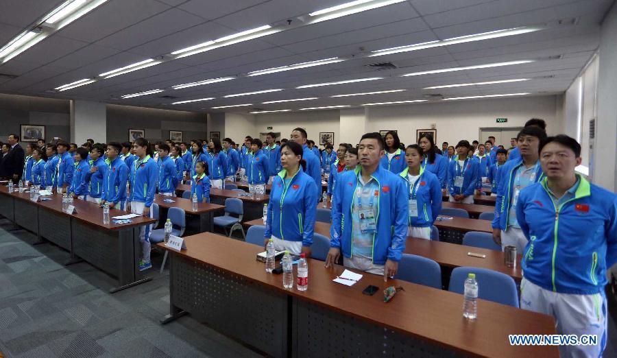 Members of Chinese delegation for the 2nd Summer Youth Olympic Games sing Chinese National Anthem during a meeting in Beijing, capital of China, August 11, 2014. Chinese delegation was officially established here Monday. The opening ceremony of the 2nd Summer Youth Olympic Games will kick off in Nanjing on August 16. (Xinhua/Shao Shuai)