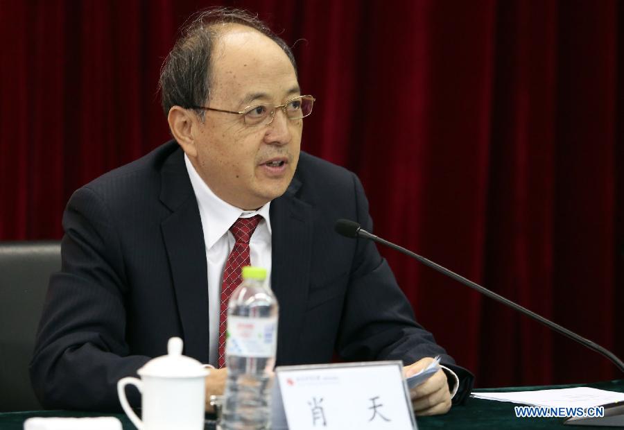 Xiao Tian, chef de mission of Chinese delegation for the 2nd Summer Youth Olympic Game, speaks during a meeting in Beijing, capital of China, August 11, 2014. Chinese delegation was officially established here Monday. The opening ceremony of the 2nd Summer Youth Olympic Games will kick off in Nanjing on August 16. (Xinhua/Shao Shuai)