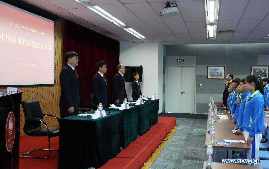 Members of Chinese delegation for the 2nd Summer Youth Olympic Games sing Chinese National Anthem during a meeting in Beijing, capital of China, August 11, 2014. Chinese delegation was officially established here Monday. The opening ceremony of the 2nd Summer Youth Olympic Games will kick off in Nanjing on August 16. (Xinhua/Shao Shuai)