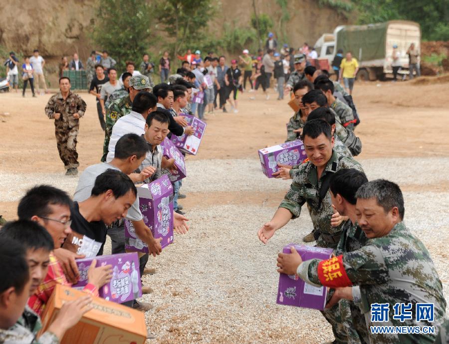 The militia in Ludian is transferring relief materials unloaded from the helicopter in Longtoushan Town.(Xinhua/Tao Liang)