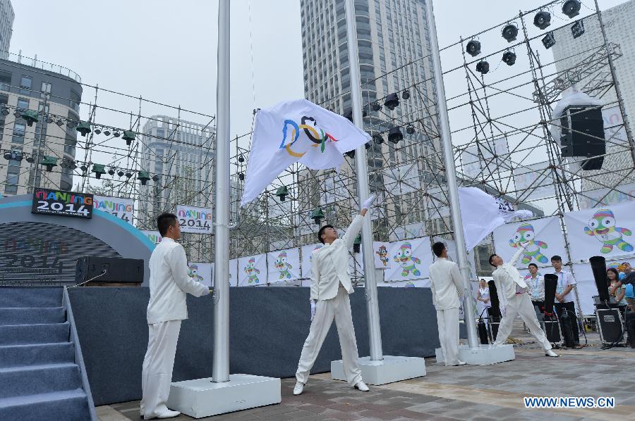 The Olympic flag is raised during the opening ceremony of the Youth Olympic village ahead of the Youth Olympic Games in Nanjing, capital of east China's Jiangsu Province, Aug, 12, 2014. The Nanjing 2014 Youth Olympic games will be held from August 16 to 28. (Xinhua/Shen Peng)