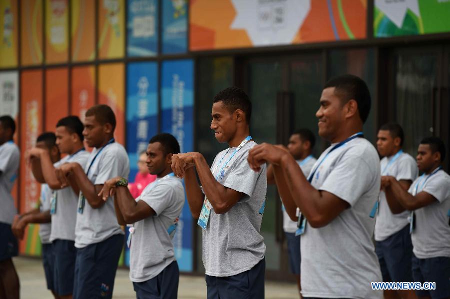 Athletes from Fiji learn Chinese kung fu during the opening ceremony of the Youth Olympic village ahead of the Youth Olympic Games in Nanjing, capital of east China's Jiangsu Province, Aug. 12, 2014. The Nanjing 2014 Youth Olympic games will be held from August 16 to 28. (Xinhua/Huang Xiaobang)