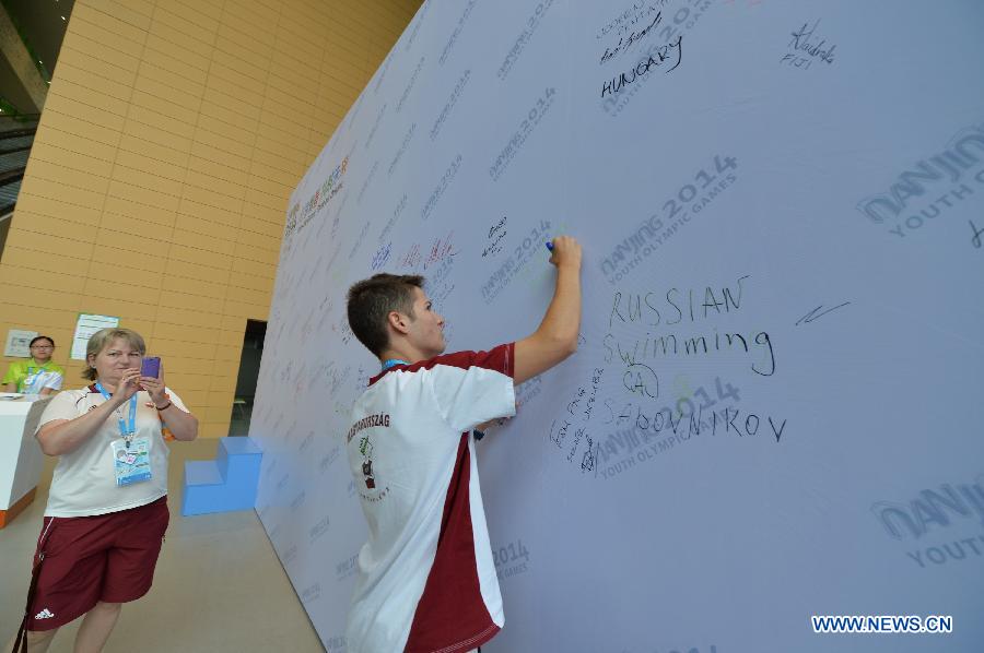 An athelete signs on a signature wall in the Youth Olympic village ahead of the Youth Olympic Games in Nanjing, capital of east China's Jiangsu Province, Aug, 12, 2014. The Nanjing 2014 Youth Olympic games will be held from August 16 to 28. (Xinhua/Shen Peng)