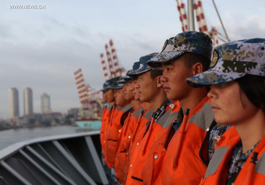 Chinese Navy soldiers onboard the amphibious landing ship Changbaishan prepare to berth at the Colombo Harbor in Comlombo, Sri Lanka, Aug. 12, 2014. China's amphibious landing ship Changbaishan and frigate Yuncheng of the 18th escort fleet of Chinese Navy arrived in Colombo of Sri Lanka on Tuesday. The two ships will stay here for one day before they resume their voyage to fulfill their mission in the Somali waters. (Xinhua/Zhang Yuelin)