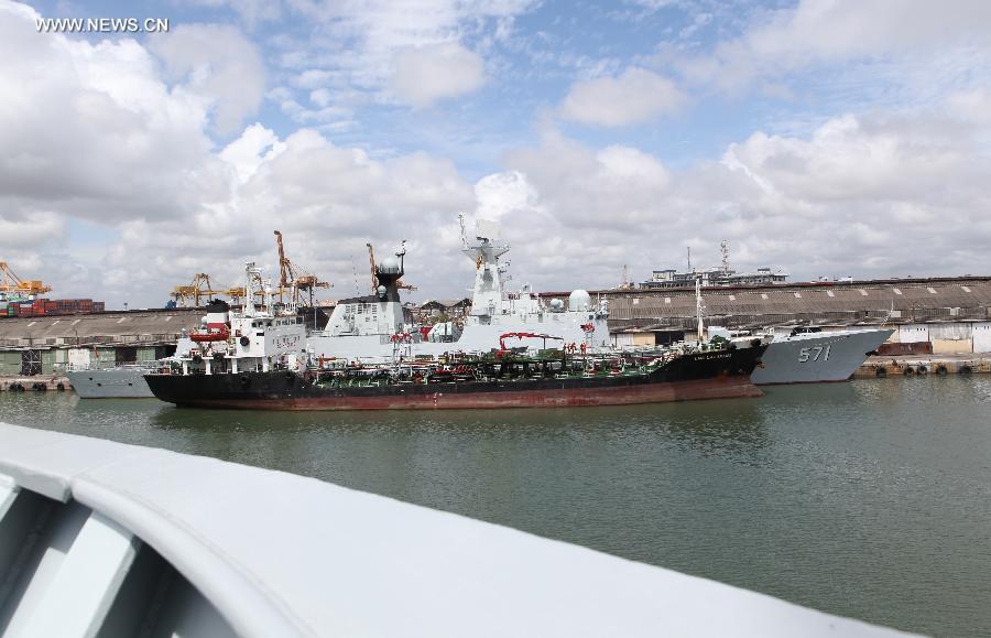 | Frigate Yuncheng refuels at the Colombo Harbor in Comlombo, Sri Lanka, Aug. 12, 2014. China's amphibious landing ship Changbaishan and frigate Yuncheng of the 18th escort fleet of Chinese Navy arrived in Colombo of Sri Lanka on Tuesday. The two ships will stay here for one day before they resume their voyage to fulfill their mission in the Somali waters. (Xinhua/Zhang Yuelin) |