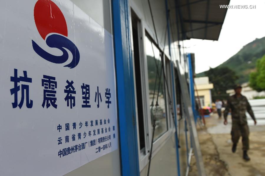 The first Hope Primary School built after a 6.5-magnitude earthquake is inaugurated in Longtoushan Township in earthquake-hit Ludian County, southwest China's Yunnan Province, Aug. 12, 2014. The Hope Primary School, sponsored by China Youth Development Foundation and Yunnan Youth Development Foundation, is the first one built after the 6.5-magnitude earthquake. The school, which is able to accommodate more than 500 students, has 20 prefabricated rooms with each covering 56.8 square meters. A 6.5-magnitude earthquake hit Ludian of southwest China's Yunnan Province on Aug. 3, which claimed at least 617 lives and injured thousands of others. (Xinhua/Lin Yiguang)