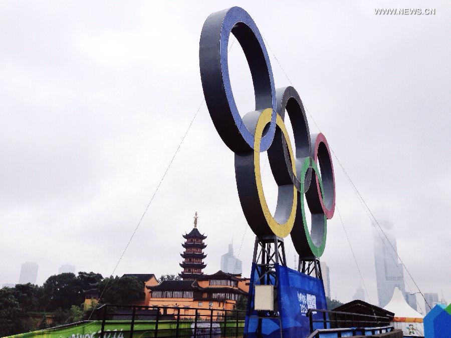 | A photo taken on Aug. 13, 2014, shows a view of a sculpture of the Olympic Rings settled on the Jiefangmen Gate of the Nanjing city Wall from Ming Dynasty and the Jiming Temple in Nanjing, capital of east China's Jiangsu Province, on Aug. 13, 2014. The 2nd Summer Youth Olympic Games will be held in Nanjing from August 16 to 28. (Xinhua/Chen Yehua) |