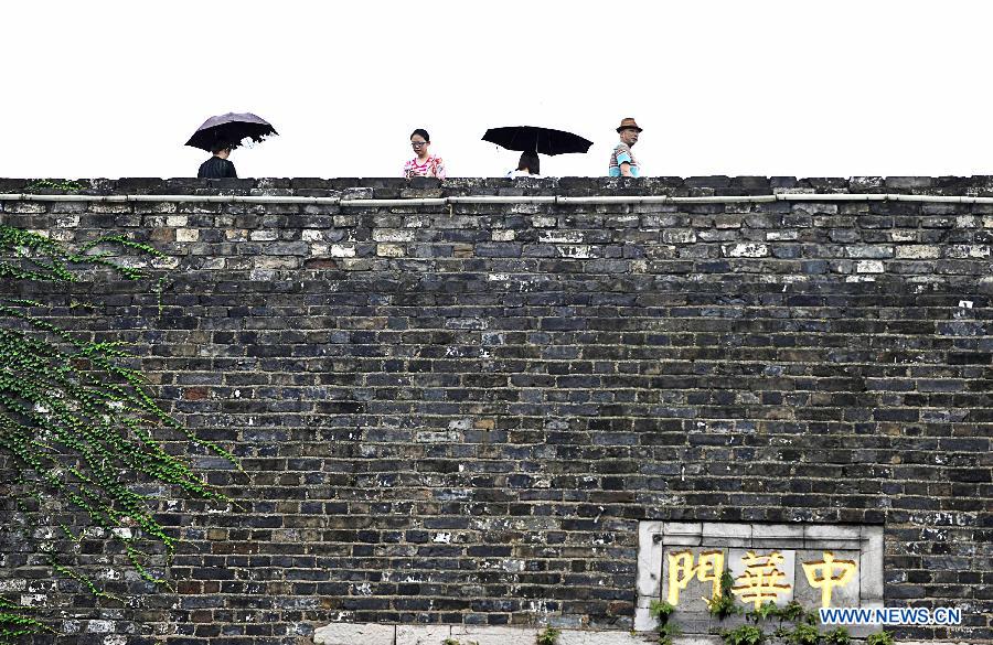 Travelers visit Zhonghua Gate of the Ming Dynasty city wall on Aug. 13, 2014. The 2nd Summer Youth Olympic Games will kiss off on August 16 in Nanjing, capital of east China's Jiangsu Province. (Xinhua/Yue Yuewei)