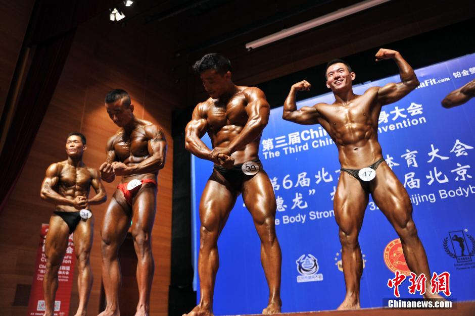 Competitors perform onstage during a bodybuilding competition in Beijing on August 13, 2014. 2014 ChinaFit Convention was held in the China National Convention Center from August 12 to 13. (CNS/Jin Shuo)