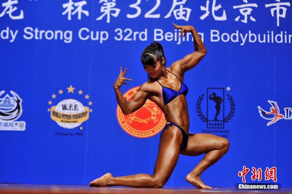 Competitors perform onstage during a bodybuilding competition in Beijing on August 13, 2014. 2014 ChinaFit Convention was held in the China National Convention Center from August 12 to 13. (CNS/Jin Shuo)