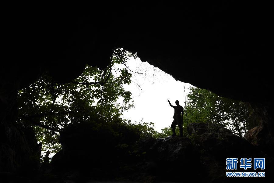 An official shows the site of former command posts of the Flying Tigers in a cave on Aug. 13, 2014. (Xinhua/Lu Bo'an)