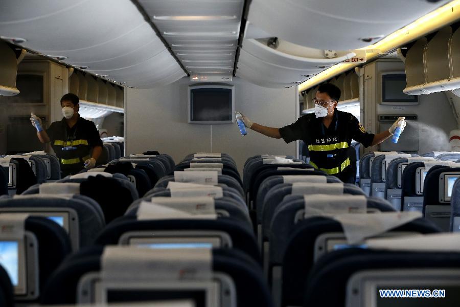 A quarantine staff member sterilizes a cabin of a flight which flies from Frankfurt, a possible transfer stop for travelers who have been to western Africa, at the Beijing Capital International Airport in Beijing, capital of China, Aug. 14, 2014. To prevent the deadly Ebola virus from entering China, China's quarantine authority implements stricter inspections on inbound flights from regions affected by Ebola and step up sanitary measures on incoming goods. (Xinhua/Shen Bohan)
