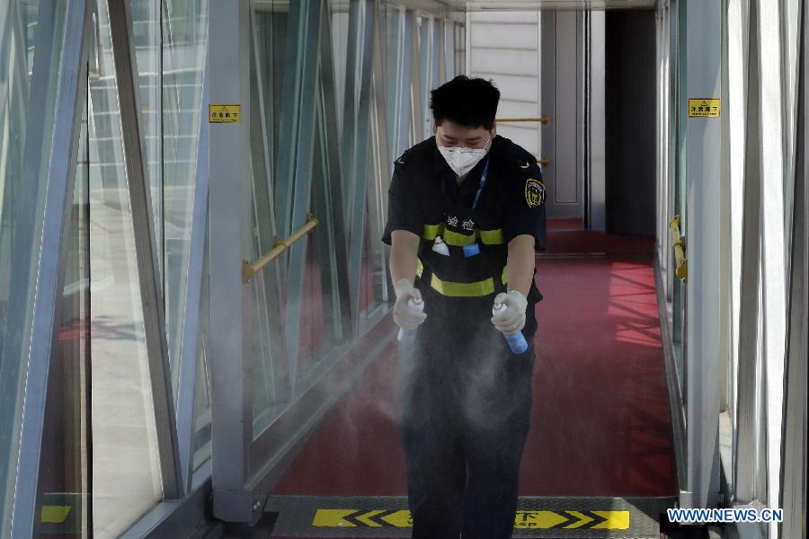 A quarantine staff member sterilizes a corridor after passengers from Frankfurt, a possible transfer stop for travelers who have been to western Africa, arrive at the Beijing Capital International Airport in Beijing, capital of China, Aug. 14, 2014. To prevent the deadly Ebola virus from entering China, China's quarantine authority implements stricter inspections on inbound flights from regions affected by Ebola and step up sanitary measures on incoming goods. (Xinhua/Shen Bohan)