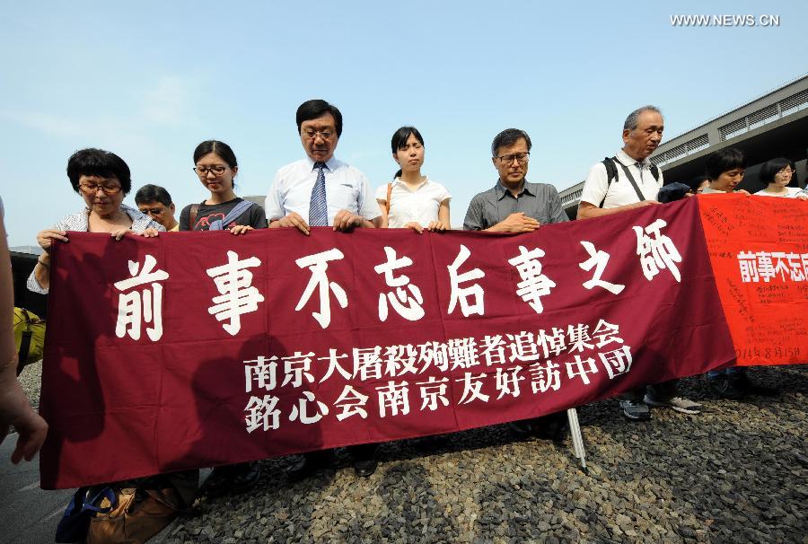 Zhu Chengshan (3rd L, front), curator of the Memorial Hall of the Victims in Nanjing Massacre by Japanese Invaders, mourns for victims of the Nanjing Massarce with Japanese delegates during an assembly in Nanjing, capital of east China's Jiangsu Province, Aug. 15, 2014. Friday marked the 69th anniversary of Japan's unconditional surrender at the end of world War II. (Xinhua/Sun Can)