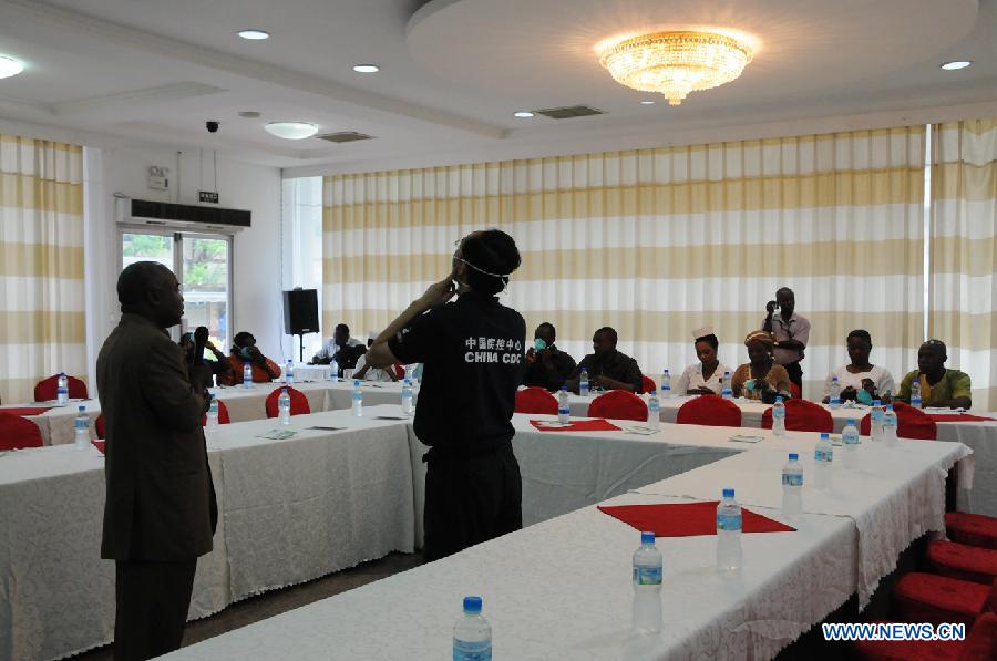 Members of Chinese medical expert team demonstrate during a training with Sierra Leone medical workers in Freetown, Sierra Leone, Aug. 14, 2014. China has sent three expert teams and medical supplies to Guinea, Liberia and Sierra Leone to assist in the prevention and control of the Ebola virus. (Xinhua/Lin Xiaowei)