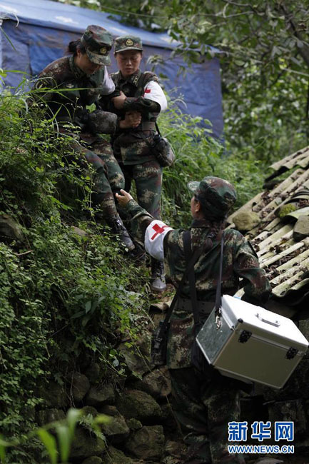 Female soldiers from a hospital of the Second Artillery Force walk into the hardest hit area on Aug. 14, 2014. (Xinhua/Zhang Guangyu)