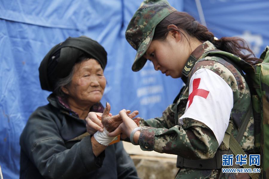 Female soldiers from a hospital of the Second Artillery Force treat villagers on Aug. 14, 2014. (Xinhua/Zhang Guangyu)