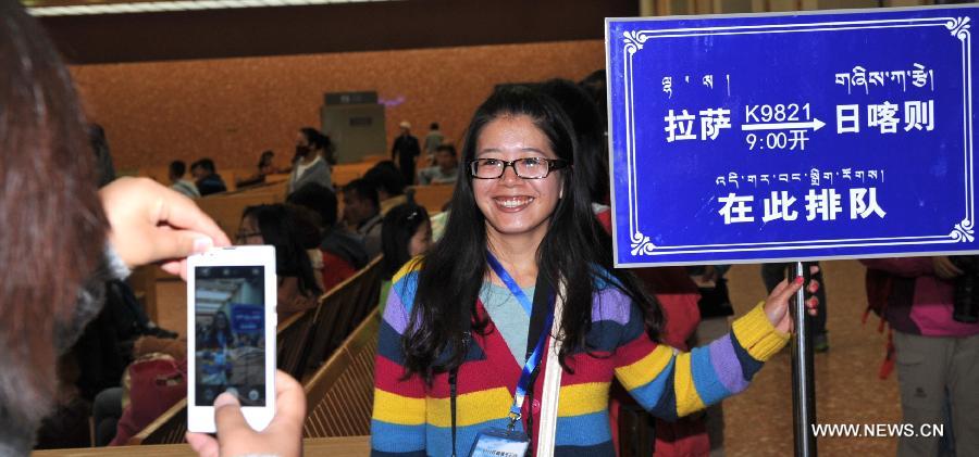 | A passenger to take the train from Lhasa to Xigaze poses for photo as she wait for boarding the train at Lhasa Railway Station in Lhasa, capital of southwest China's Tibet Autonomous Region, Aug. 16, 2014. A second railway line in southwest China's Tibet Autonomous Region, which is 251 kilometers long and links the regional capital Lhasa and Xigaze, the second-largest city in the region, was officially put into use. (Xinhua/Soinam Norbu) |