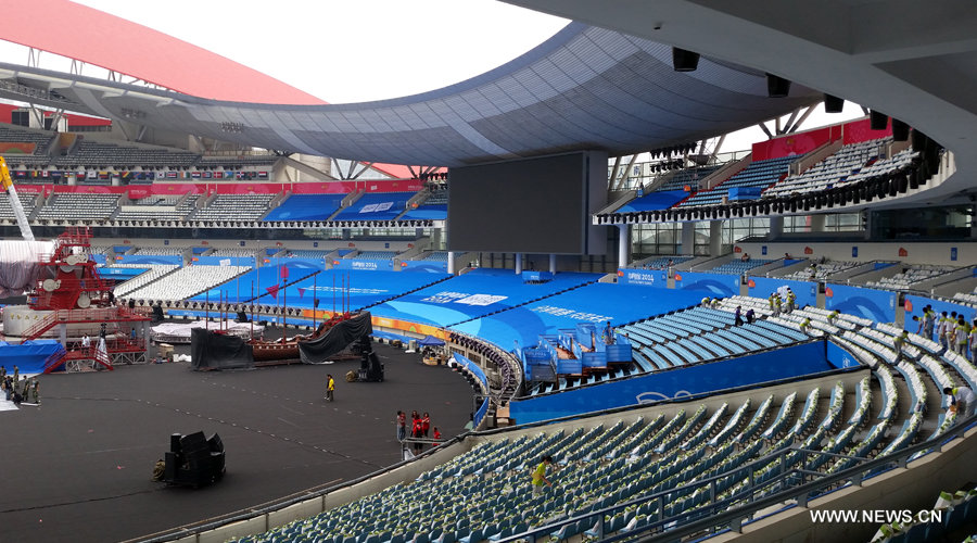 Photo taken on August 16, 2014 shows the rehearsal of Youth Olympic Games (YOG) in Nanjing Olympic Sports Center. The opening ceremony of YOG will start at 8:00 pm on August 16, 2014. (Xinhuanet/Wang Hanlin)