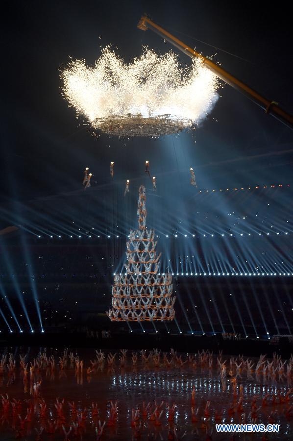 Performers from Songshan Shaolin Tagou Martial Arts School at Dengfeng, Henan Province perform aerial stunts during the opening ceremony of Nanjing 2014 Youth Olympic Games in Nanjing, capital of east China’s Jiangsu Province, Aug. 16, 2014. (Xinhua/Meng Yongmin)