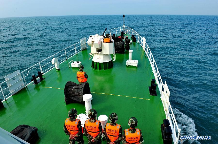 Soldiers of Fujian Coast Guard Forces take part in an offshore drill on a naval vessel at the Meizhou Bay, southeast China's Fujian Province, Aug. 16, 2014. (Xinhua/Zhang Guojun)