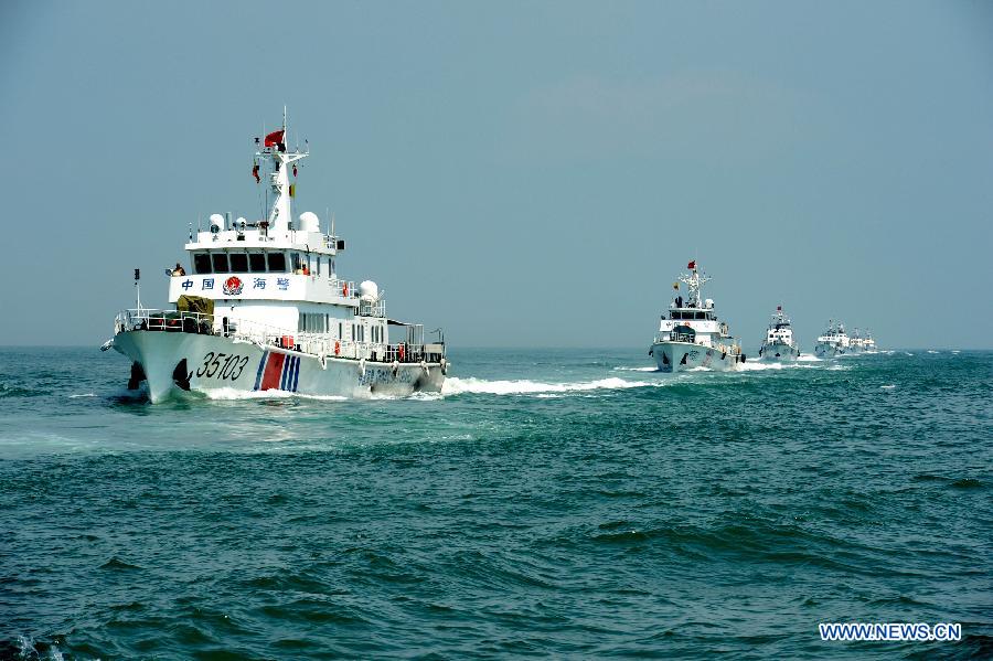 Naval vessels of Fujian Coast Guard Forces take part in an offshore drill at the Meizhou Bay, southeast China's Fujian Province, Aug. 16, 2014. (Xinhua/Zhang Guojun)