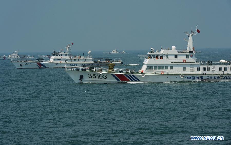 Naval vessels of Fujian Coast Guard Forces take part in an offshore drill at the Meizhou Bay, southeast China's Fujian Province, Aug. 16, 2014. (Xinhua/Zhang Guojun)