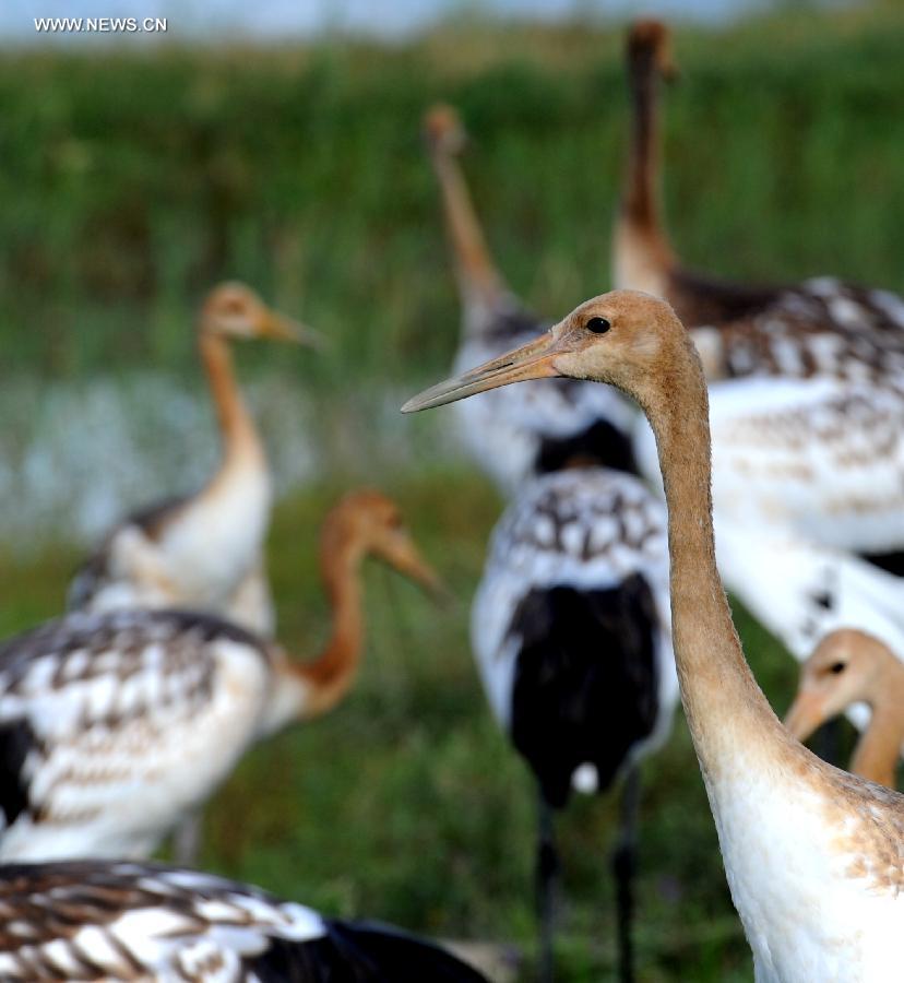 | Young red-crowned cranes are seen at the Zhalong Natural Reserve in Qiqihar, northeast China's Heilongjiang Province, Aug. 17, 2014. (Xinhua/Wang Song) |