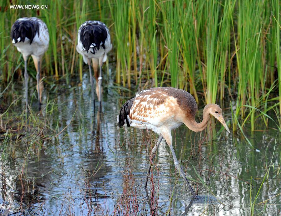 Young red-crowned cranes are seen at the Zhalong Natural Reserve in Qiqihar, northeast China's Heilongjiang Province, Aug. 17, 2014. (Xinhua/Wang Song)