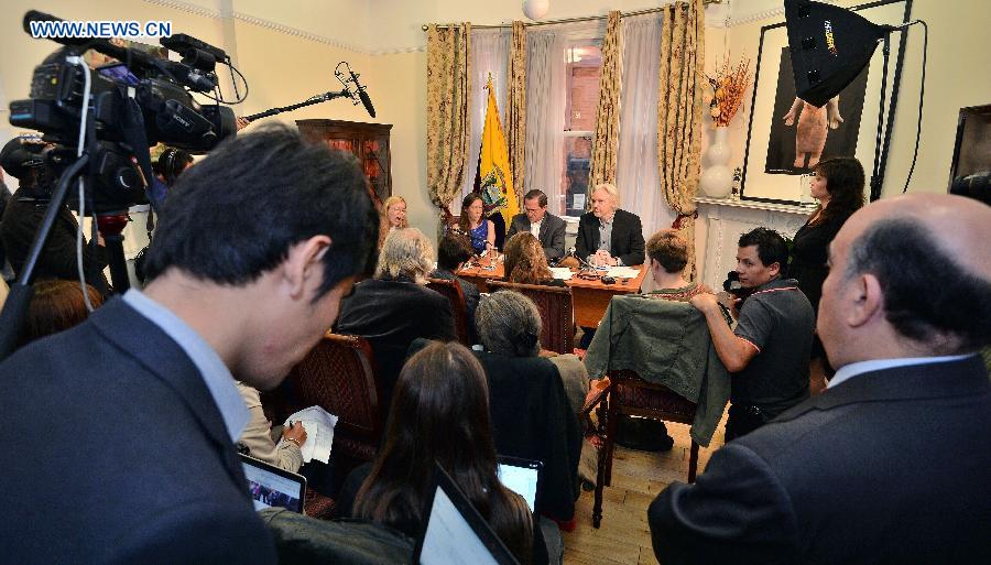 WikiLeaks founder Julian Assange (1st R, back) attends a press conference at the Ecuadorian Embassy in London, Britain, Aug. 18, 2014. WikiLeaks founder Julian Assange said on Monday that he would be leaving the Ecuadorian Embassy in London soon, where he had taken refuge for two years. (Xinhua/Press Association/John Stillwell)