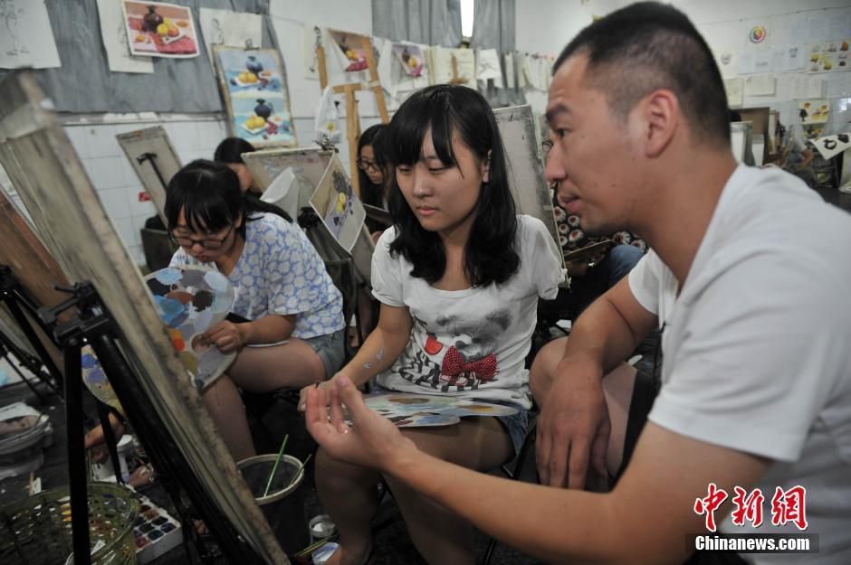 A Dan, a kindhearted painting teacher, is teaching the one-armed girl Yong Qian on August 16, 2014. (Photo/CNS)
