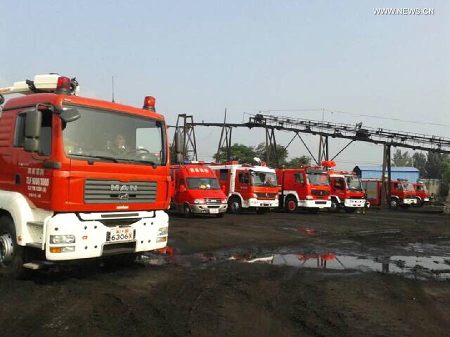 Photo taken with a mobile phone shows fire engines at the accident site after gas outburst occurred in Dongfang Coal Mine in Xiejiaji District of Huainan City, east China's Anhui Province, Aug. 19, 2014. More than 20 people have been missing in the accident which happened in the early morning on Tuesday. (Xinhua)