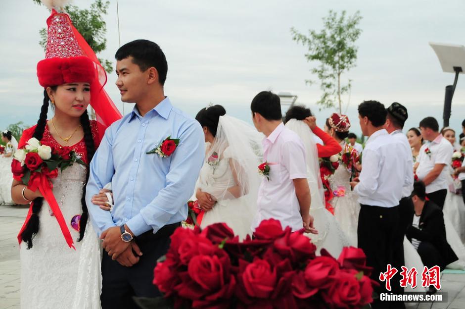 A group wedding is held for 60 couples in Yining, Kazak Autonomous Prefecture of Ili, Xinjiang Uyghur Autonomous Region on Aug. 18, 2014. The day marks the 60th anniversary of the founding of the prefecture. (Chinanews/Ma Xinlong)