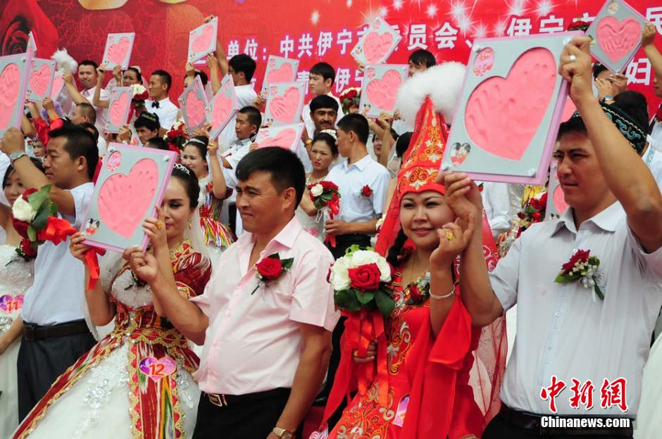 | A group wedding is held for 60 couples in Yining, Kazak Autonomous Prefecture of Ili, Xinjiang Uyghur Autonomous Region on Aug. 18, 2014. The day marks the 60th anniversary of the founding of the prefecture. (Chinanews/Ma Xinlong) |