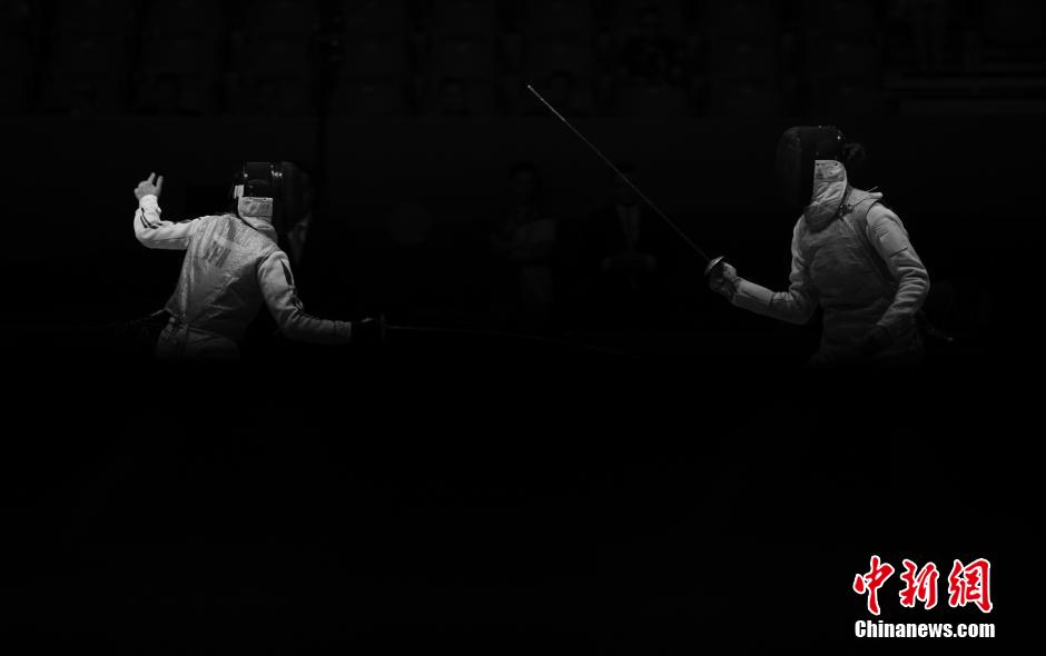 Sabrina Massialas (R) from the U.S. fights for the gold medel. Massialas beat Karin Miyawaki (L) from Japan at the Gold Medal Bout of Women's Foil Individual at YOG on Aug. 17, 2014. (CNS/Hou Yu)