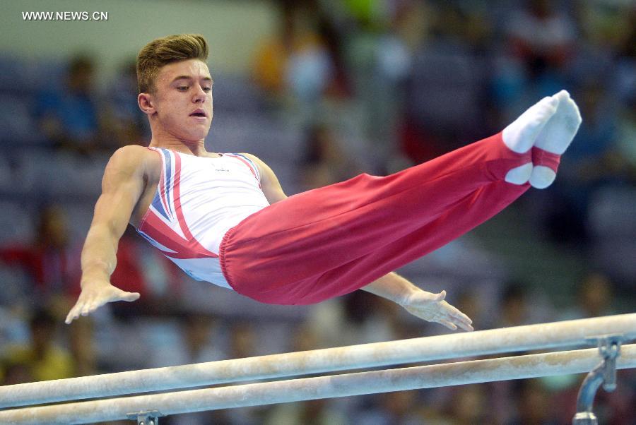 Gold medalist Giarnni Regini-Moran of Great Britain competes in the men's all-around final of artistic gymnastics at the 2nd Summer Youth Olympic Games (YOG) in Nanjing, capital of east China's Jiangsu Province, August 19, 2014. (Xinhua/Cheng Min)
