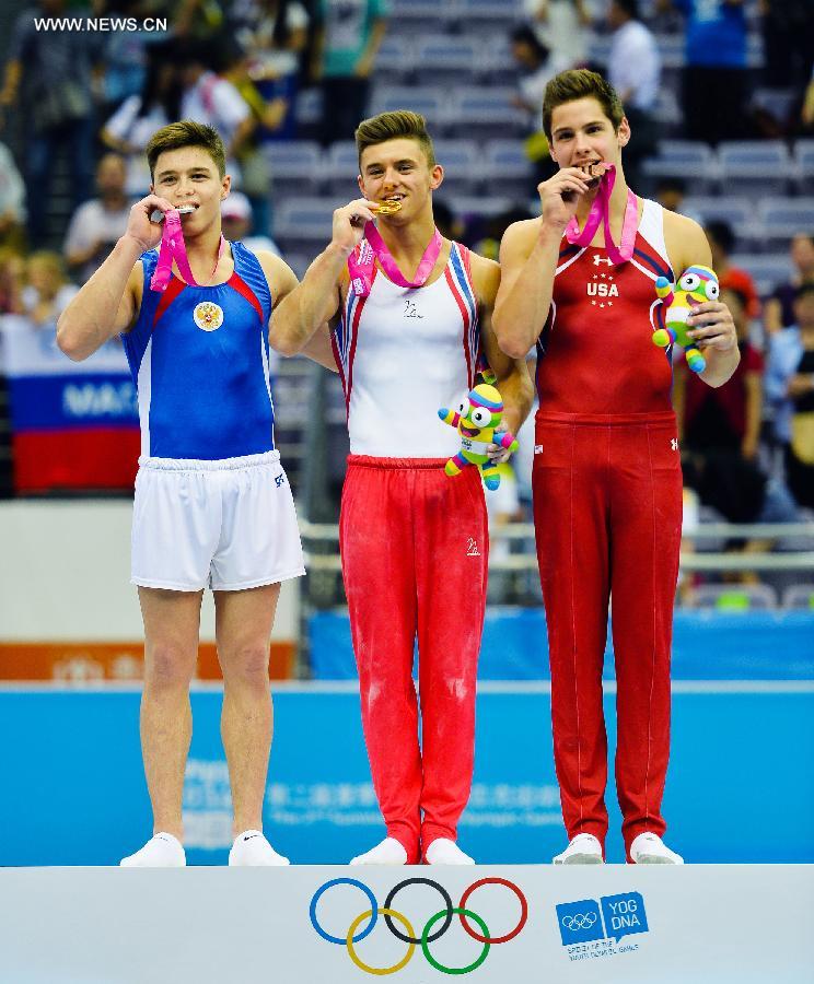 Gold medalist Giarnni Regini-Moran of Great Britain celebrates after the men's all-around final of artistic gymnastics at the 2nd Summer Youth Olympic Games (YOG) in Nanjing, capital of east China's Jiangsu Province, August 19, 2014. (Xinhua/Cheng Min)