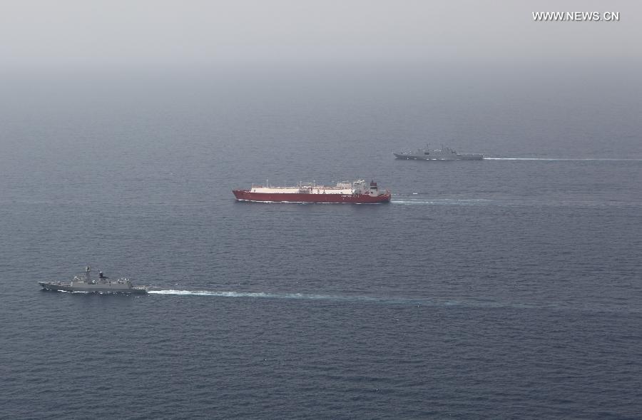 Convoy fleets of Chinese Navy are seen during an escort mission in the Gulf of Aden, Aug. 19, 2014. The 17th and the 18th Chinese Navy escort fleets conducted an escort mission together for three commercial vessels on Tuesday. (Xinhua/Zhang Yuelin)