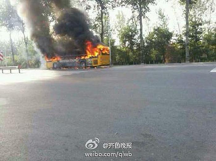 Photo taken with mobile phone on Aug. 20, 2014 shows the accident site of the bus fire in Longkou City, east China's Shandong Province. One was killed and 19 others injured after a public bus caught fire during rush hour here on Wednesday. The cause of the fire is under investigation.(Weibo.com/qlwb)