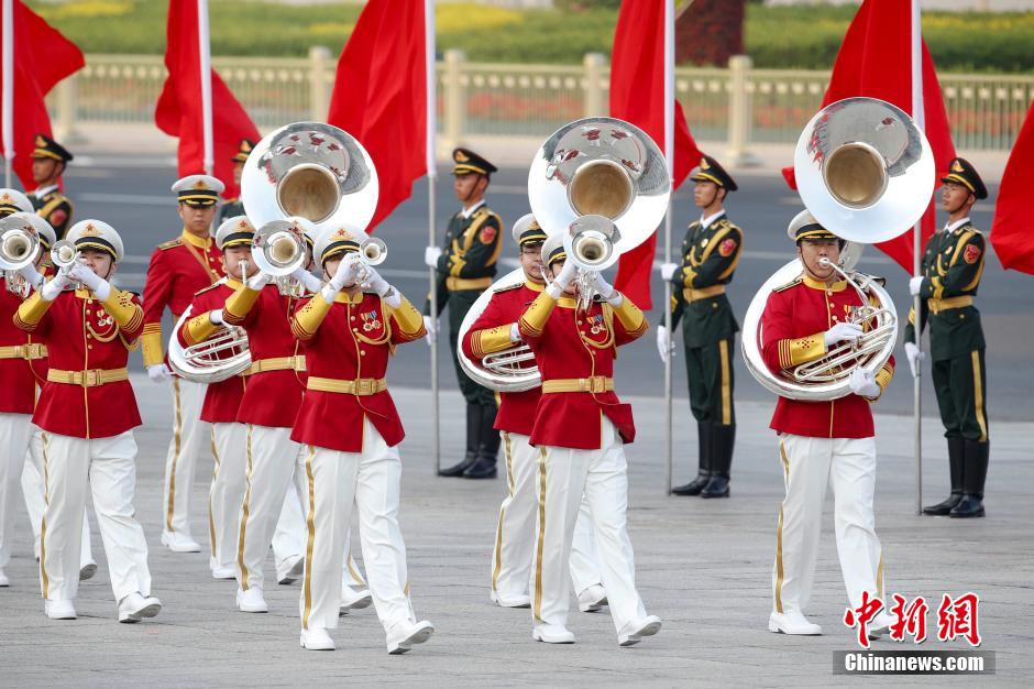 The military band of the PLA performs at the welcome ceremony attended by President Xi Jinping and visiting Uzbek President Islam Karimov on Aug. 19, 2014. (CNS/Du Yang)