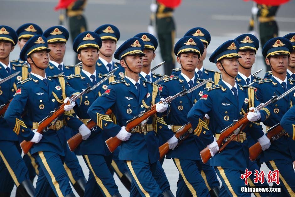 The Guard of Honor of the People's Liberation Army wearing the new type of uniform is reviewed at the welcome ceremony on Aug. 19, 2014. (CNS/Du Yang)