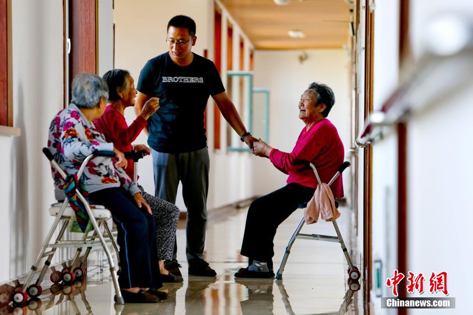 Tang Yixiang chats with the senior. (CNS/Lu Xin)