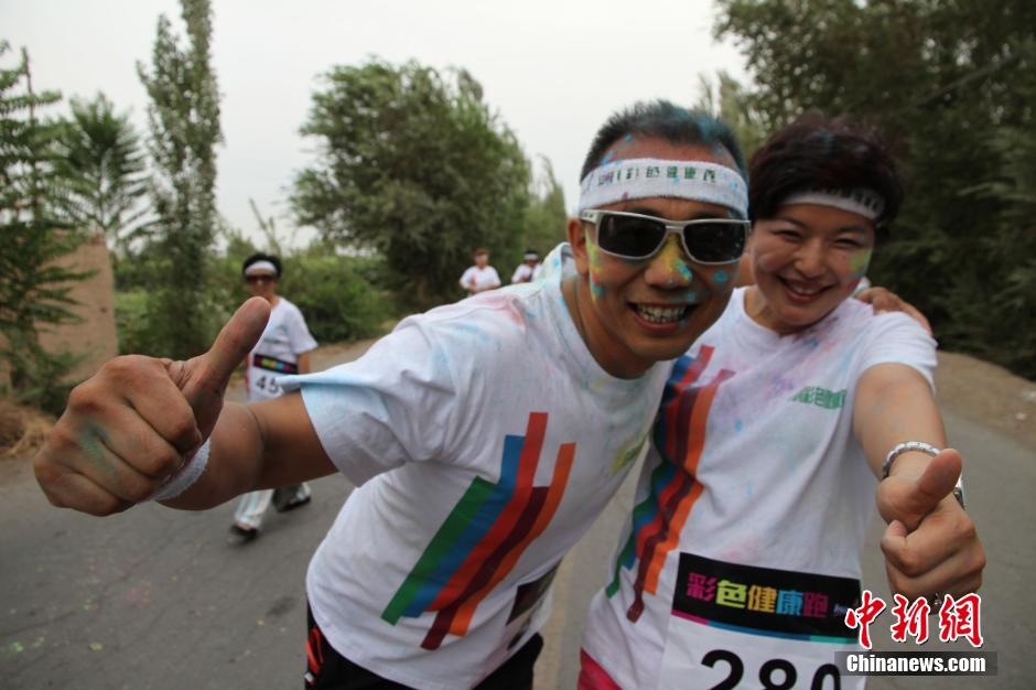 Residents in Turpan welcome Grape Festival with the 'Color Run' on the evening on Aug. 19, 2014. More than 600 people in white T-shirts ran 5.2 kilometers before they arrived at the Turpan library.