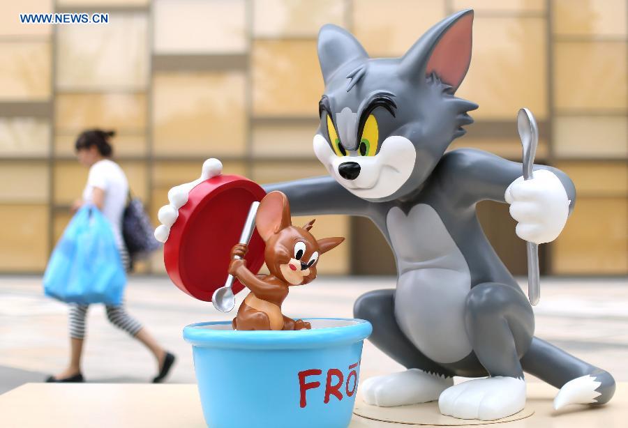 Photo taken on Aug. 22, 2014 shows models of Metro-Goldwyn-Mayer cartoon characters Tom and Jerry outside a shopping mall in Shenyang, capital of northeast China's Liaoning Province, Aug. 22, 2014. (Xinhua/Yao Jianfeng)