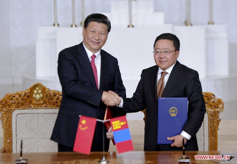 Chinese President Xi Jinping (L) shakes hands with his Mongolian counterpart Tsakhiagiin Elbegdorj during a signing ceremony after their talks in Ulan Bator, Mongolia, Aug. 21, 2014. Xi arrived in Ulan Bator Thursday for a two-day state visit to Mongolia. (Xinhua/Zhang Duo)