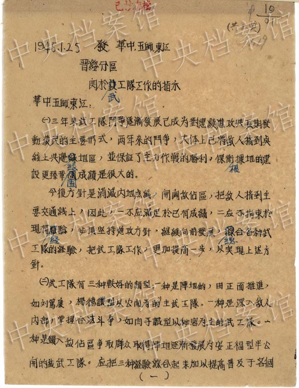 The Central Committee of the CPC instructed the Central China Bureau, the Fifth Division of the New Fourth Army, East River Column to develop the armed working teams on January 25, 1945. (Photo/China's State Archives Administration)
