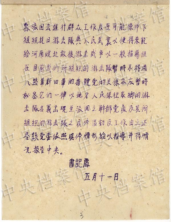The Administration)he Secretariat of the Central Committee of the Communist Party of China gave an instruction on expanding military presence in Henan province in May 1944. (Photo/China's State Archive)