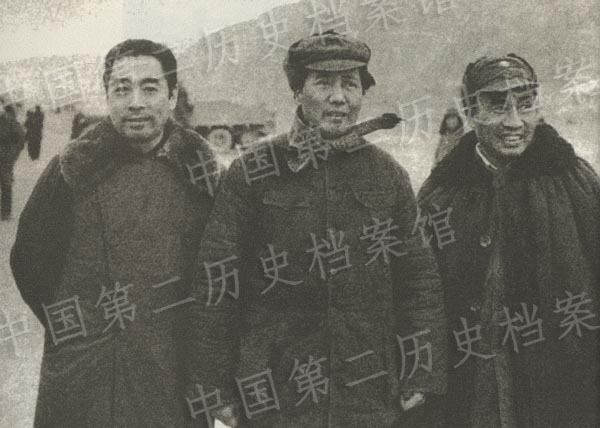 Zhou Enlai, Mao Zedong and Zhu De(from left to right)at the Yan’an airport on December 7, 1944. (Photo/Second Historical Archives of China)