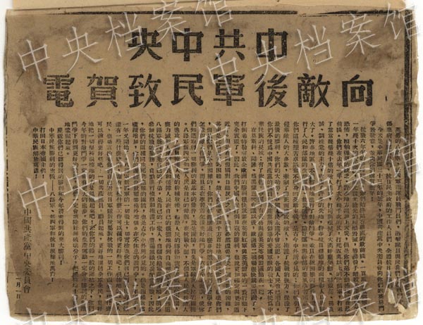 In response to the international situation and the situation on the battlefield since 1944, the anti-Japanese forces led by the Communist Party of China (CPC) fought in the enemy’s rear areas such as North China, Central China and South China to support Nationalist Chinese Army on the front line battlefield and enlarged the anti-Japanese revolutionary bases. These forces started to use mobile warfare as the basic form and made preparations for the massive counter-attacks against Japanese army. On January 1, 1944, the Central Committee of the CPC said in the New Year’s message that with the efforts made by the army and people in the enemy’s rear area, China was able to be recognized as one of the major powers on par with the Soviet Union, the United States and Britain. On April 12, 1944, Mao Zedong gave a report and said that the CPC should be prepared to throw Japanese army out of China. In 1944, the anti-Japanese forces led by the CPC fought over more than 20 thousand battles, annihilated 200 thousand Japanese and puppet troops, liberated some twenty counties and saved more than 17 million people from the yoke of Japan’s rule. These forces continued their fight against Japanese army until the summer of 1945. Chinese army made huge sacrifices in the fight against Japanese army on the front line battlefield and retook lost ground. All these counter-attacks dealt the Japanese army heavy blows and speeded up Japan’s defeat.